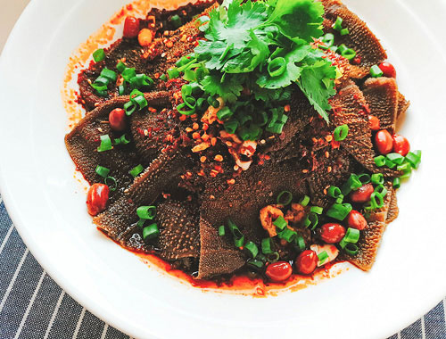 6、調(diào)好的汁水淋在擺好的毛肚上,均勻的撒上油酥花生、蔥花、香菜擺中間。
